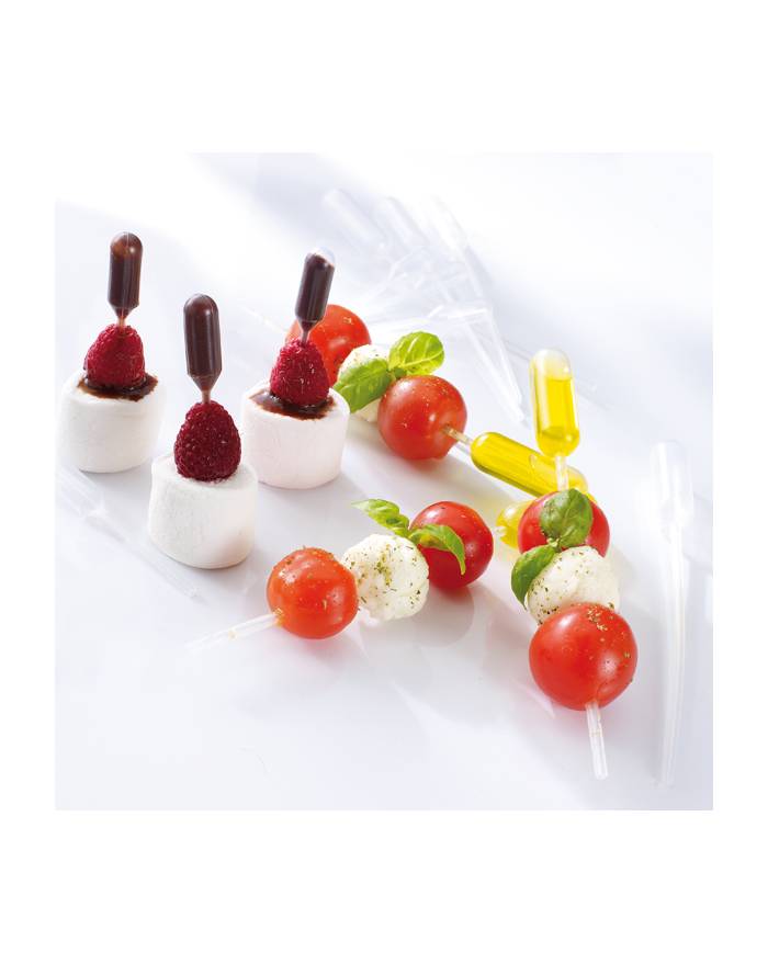 Sweet Flavor foodstuff grade disposable pipettes 15 ml are manufactured from eco friendly plastic and great for aperitif, beverages and truffles.