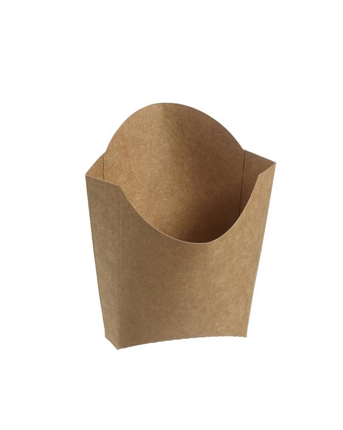 Sweet Flavor's Kraft Fries Pocket Containers, available in a natural brown hue, are a popular choice for all kinds of takeaway food items. Perfect for fries, veggie sticks, churros, or any type of finger food. Our Solia pocket containers are made of brown Kraft paper with a stain-resistant inner coating, and are designed to securely transport food easily and safely, thanks to its sturdy design. Sold in boxes of 1200 pieces, our containers are able to withstand temperatures from 0 to 158 degrees Fahrenheit.