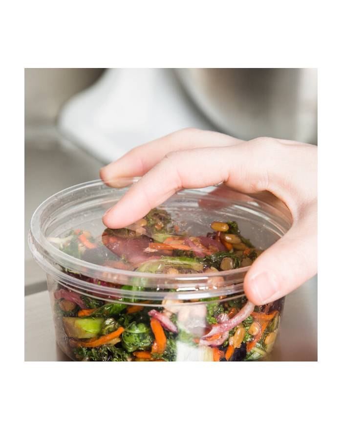 Crystal Clear Recycled PET Plastic Round lid for Deli Container. The perfect match for our PET crystal clear deli container 8, 12 16 and 32 oz. This lid is perfect for transportation.