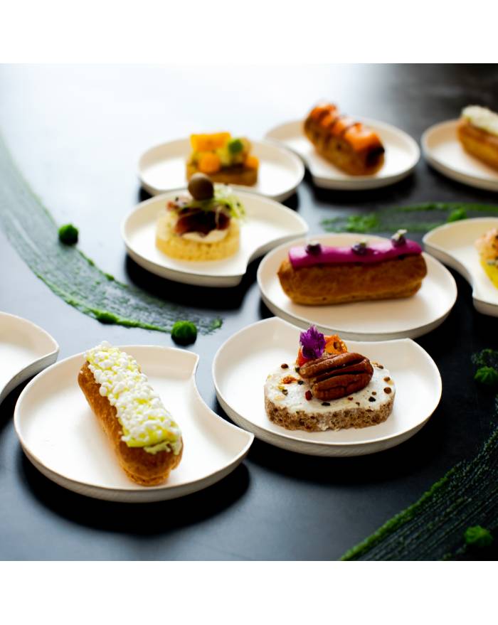 Looking for an original disposable appetizer plate? Discover Ano, a full collection of compostable round plate. The collection includes full round plates in different sizes as well as half moon plates that will allow you to compose your creation in many different ways.