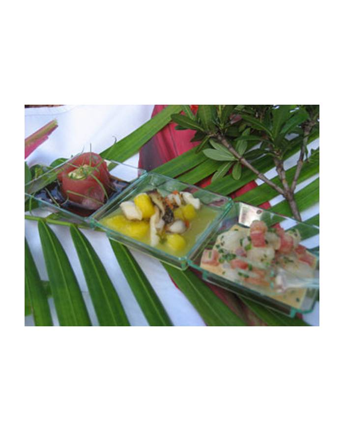 Famous Trio mini plastic plates, one of our oldest product but still really popular. Disposable and recyclable our mini plastic trio plate will allo you to served 3 different samples on the same plate so you dont need one creative idea, not tow but three...