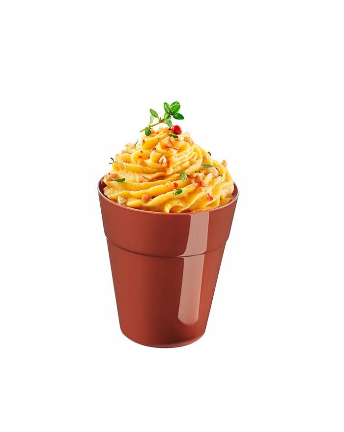 Introducing the Sweet Flavor premium disposable Brown Flower Cup, featuring a 4 oz capacity. Crafted from high-quality recyclable plastic, this flower pot design adds a unique and charming touch to private events, catering services, weddings, and more. Resembling a garden flower pot, it enhances the aesthetic appeal of your receptions with its originality and elegance. The plastic grade ensures durability and a premium feel, elevating the presentation of desserts, snacks, and other culinary delights. Additionally, this cup is available in a clear option, offering versatility to match any event theme or decor. Impress your guests with these stylish and functional disposable cups.