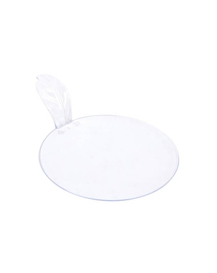 Pack of 100 Round Clear Recyclable Single Serve Dessert Board with tab 3.1 in diameter. Fancy way to display first class pastries. Those round small dessert plates are recyclable and perfect for appetizers, pastries, cupcakes and more.