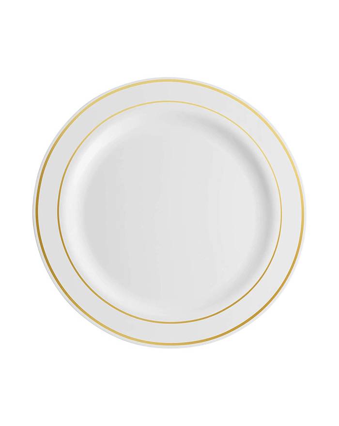 Pack of 120 recyclable white plastic plate with gold bands. Premium heavy duty 10.25 inches elegant and fancy disposable dinner plates. Perfect for Weddings, parties, reception and much more.