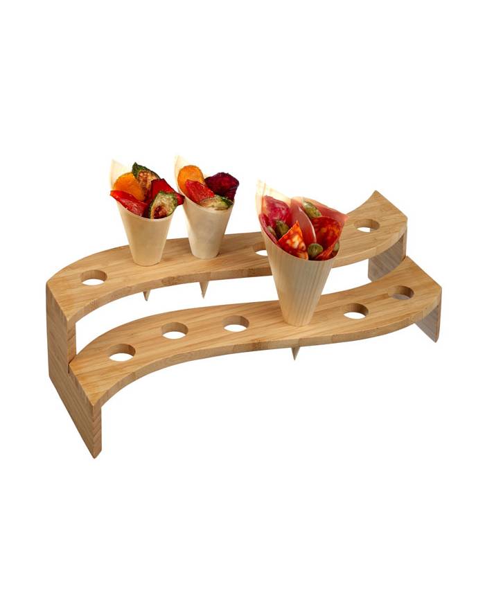 Introducing the reusable premium all-natural bamboo cone holder from Sweet Flavor. Designed specifically for our wooden and bamboo cones, this elegant display features a beautiful all-natural bamboo finish that adds a unique touch to your presentation. With 12 slots, 6 on each level, it’s perfect for showcasing our bamboo cones BD10112, as well as our wooden cones BD10129 and BD10129B. This versatile cone holder offers a stylish and functional solution for serving appetizers, desserts, and more. Please note that food cones are available and sold separately. Elevate your event with this chic and practical bamboo cone holder.