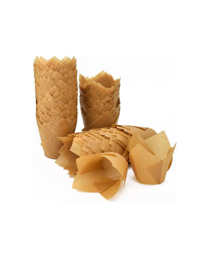 Add a touch of elegance to your baked creations with Sweet Flavor's collection of greaseproof Tulip baking cups. Made from heavyweight premium paper, these elegant cups prevent grease transfer and feature a chic, eco-friendly design that meets composting standards for easy disposal. Oven-safe up to 425 degrees Fahrenheit, they are perfect for baking muffins and cupcakes, as well as showcasing your treats beautifully in any setting. Ideal for baking breads, rolls, cakes, muffins, and small pies, our tulip baking cups are versatile enough for fresh appetizers and desserts like fruit salads, panna cotta, ice cream, and chocolate lava cake. Tulip cups come in white, natural, and brown.