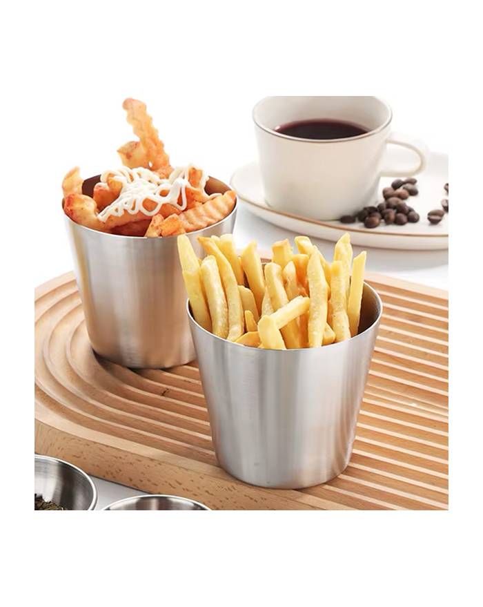 6 oz. smooth stainless steel french fry holder is a durable and sturdy solution for presenting your best appetizers and sides! Made from premium stainless steel material, this holder is the essential accessory to serve your side fries.