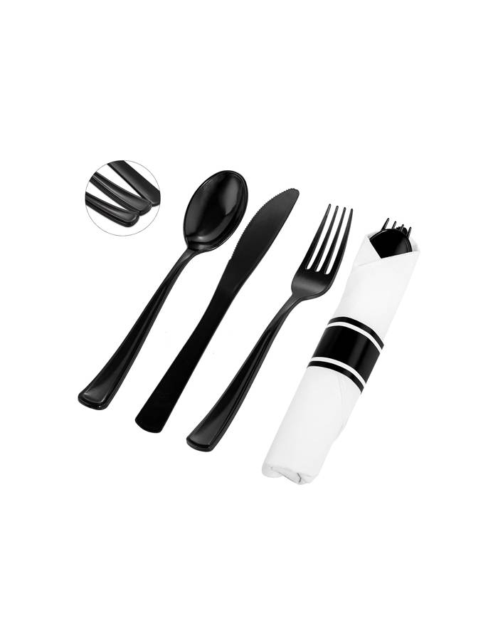 White Pre-Rolled Napkin and Black Heavy Weight Plastic Cutlery Set. white linen-feel napkin rolled around set of black, heavy weight plastic cutlery. The ready to use set comes with a knife, fork, and spoon. Made from premium heavy duty recyclable plastic, this pre rolled cutlery set is ready to use and will save you time and labor setting up.