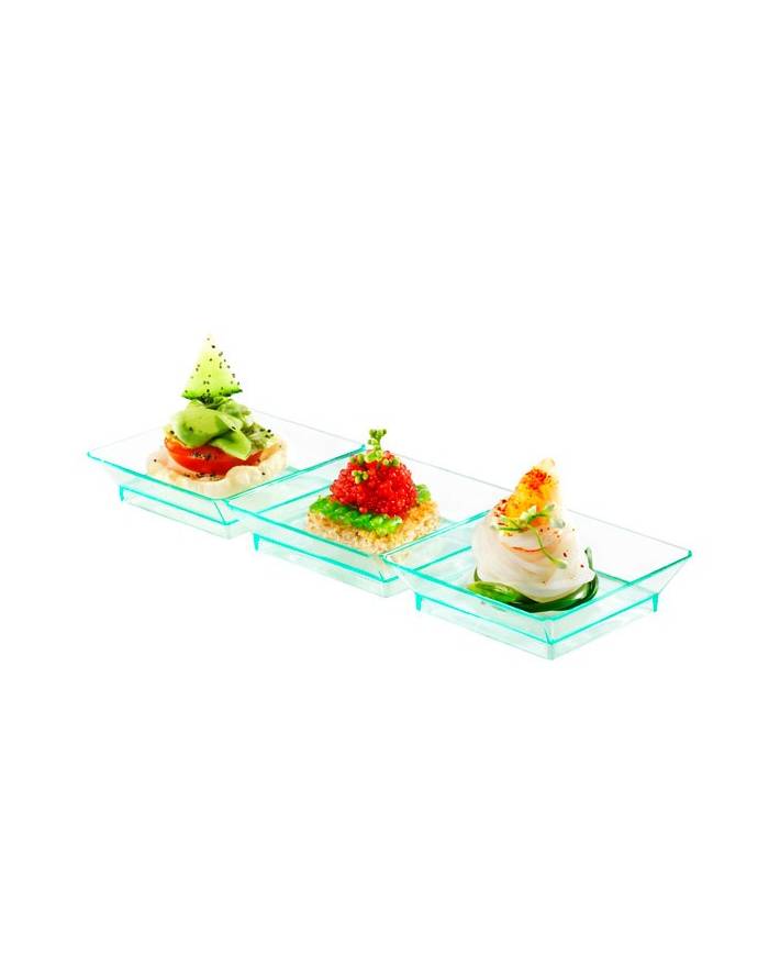 Famous Trio mini plastic plates, one of our oldest product but still really popular. Disposable and recyclable our mini plastic trio plate will allo you to served 3 different samples on the same plate so you dont need one creative idea, not tow but three...